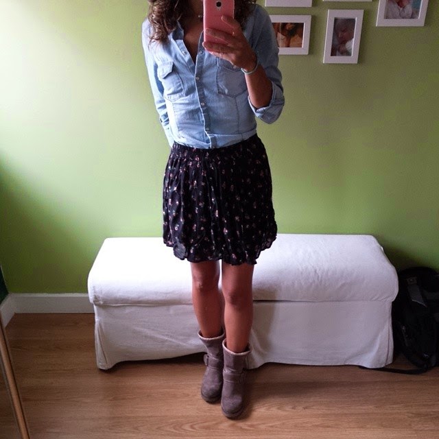 A camisa de ganga, como já vimos por aqui, é uma peça super versátil e que vai super bem com uma saia florida e fluída. As botas cortam o girly da saia e dão um arrojo especial ao look. Muito bem, Andreia! 🙂 Só fiz um pequeno reparo: que experimentasse colocar a camisa por dentro da saia. Pequeno mas que faz toda a diferença! Não acham?