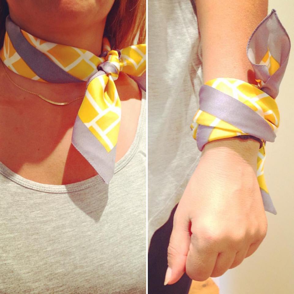 2. No pulso. Tendência bem forte também do momento é dar um ar mais badass ao lencinho de seda e usá-lo como pulseira no pulso – digam lá que não fica original? Podem ainda combiná-lo com outras pulseiras e decidirem por um braço mais bold em termos de acessórios que pode ser um ótimo ponto de destaque e diferenciação num look mais simples.